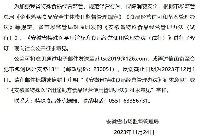 為加強(qiáng)特殊食品經(jīng)營(yíng)監(jiān)管,規(guī)范經(jīng)營(yíng)行為,保障消費(fèi)安全,根據(jù)市場(chǎng)監(jiān)管總局《企業(yè)落實(shí)食品安全主體責(zé)任監(jiān)督管理規(guī)定》《食品經(jīng)營(yíng)許可和備案管理辦法》等規(guī)定,安徽省市場(chǎng)監(jiān)督管理局對(duì)原發(fā)布的《安徽省特殊食品經(jīng)營(yíng)管理辦法(試行)》、《安徽省特殊醫(yī)學(xué)用途配方食品經(jīng)營(yíng)使用管理辦法(試行)》進(jìn)行了修訂,現(xiàn)向社會(huì)公開征求意見。