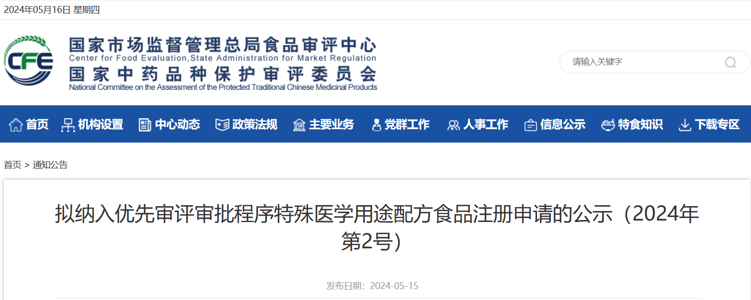 總局食品審評中心發(fā)布第2批擬納入優(yōu)先審評特醫(yī)食品注冊申請的公示
